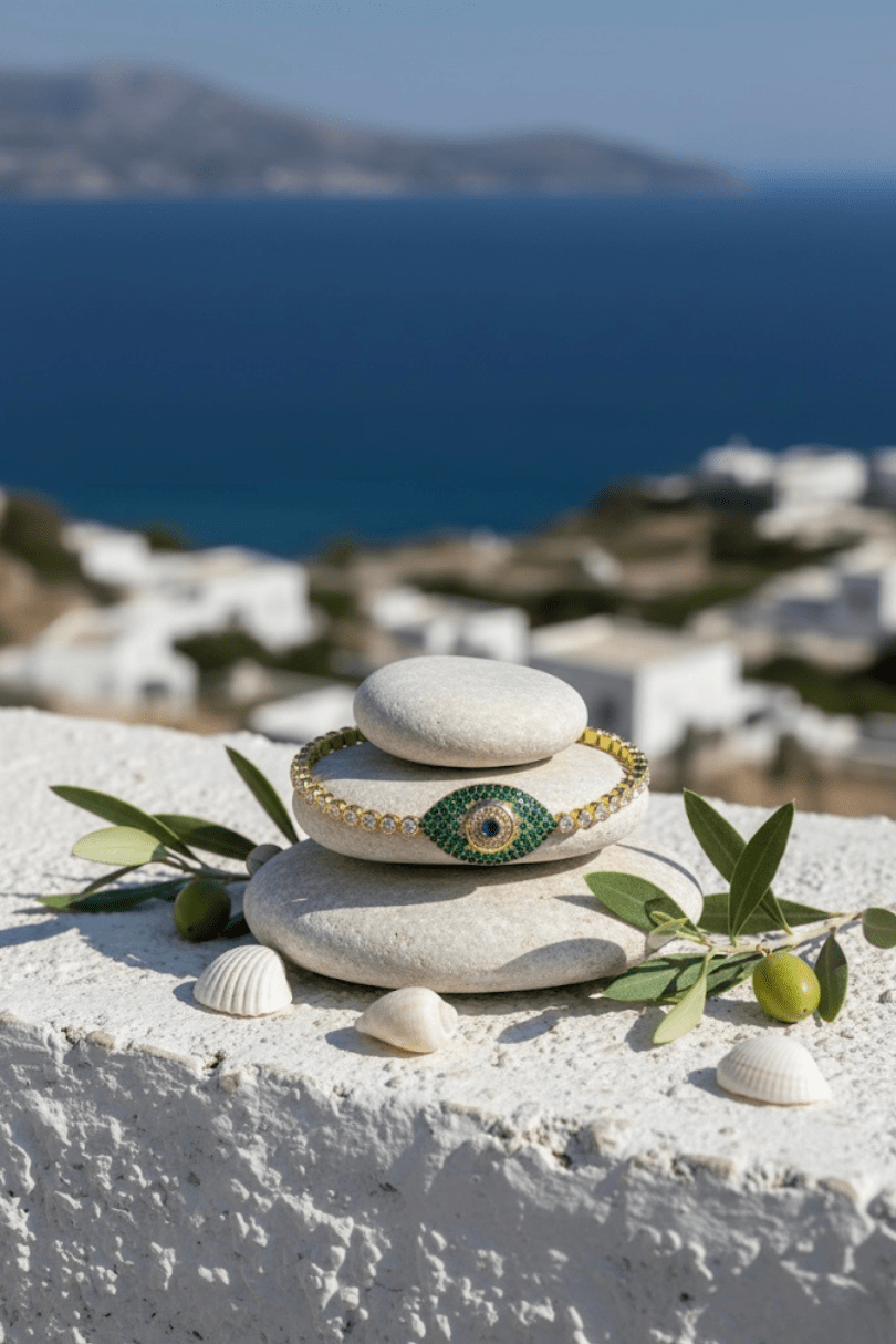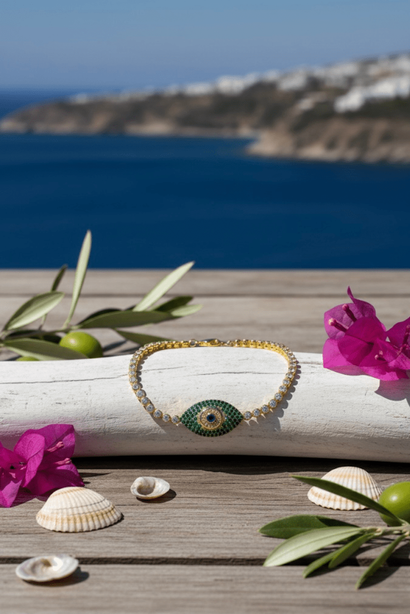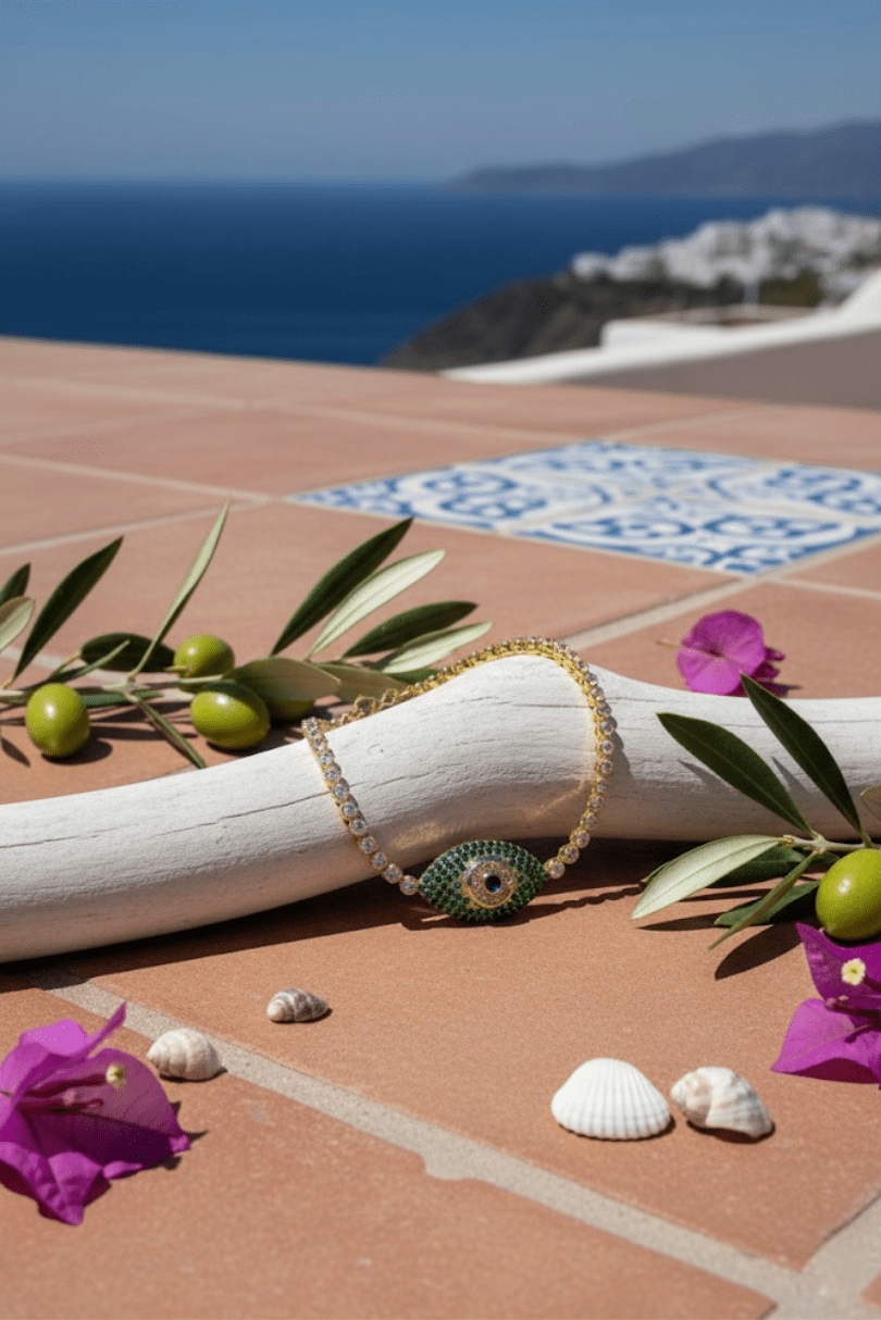 Introducing the Alexis Daoud Jewelry Evil Eye Tennis Bracelet, a stunning fusion of protection and elegance. This bracelet features sparkling bezel-set cubic zirconia along its length, with a striking center evil eye symbol crafted in green CZ diamonds for a bold, feminine touch. Set in 925 sterling silver, this piece is not only a symbol of good fortune and protection but also a statement of sophisticated style. Perfect for adding a pop of color and meaning to your look, this bracelet is a must-have for any jewelry lover.