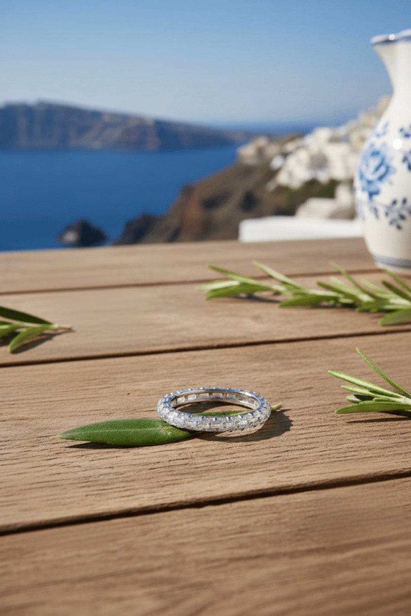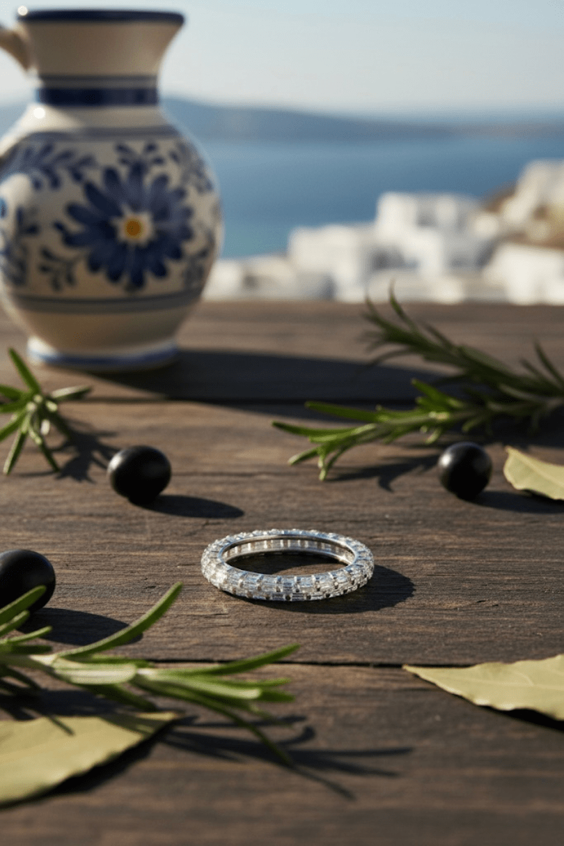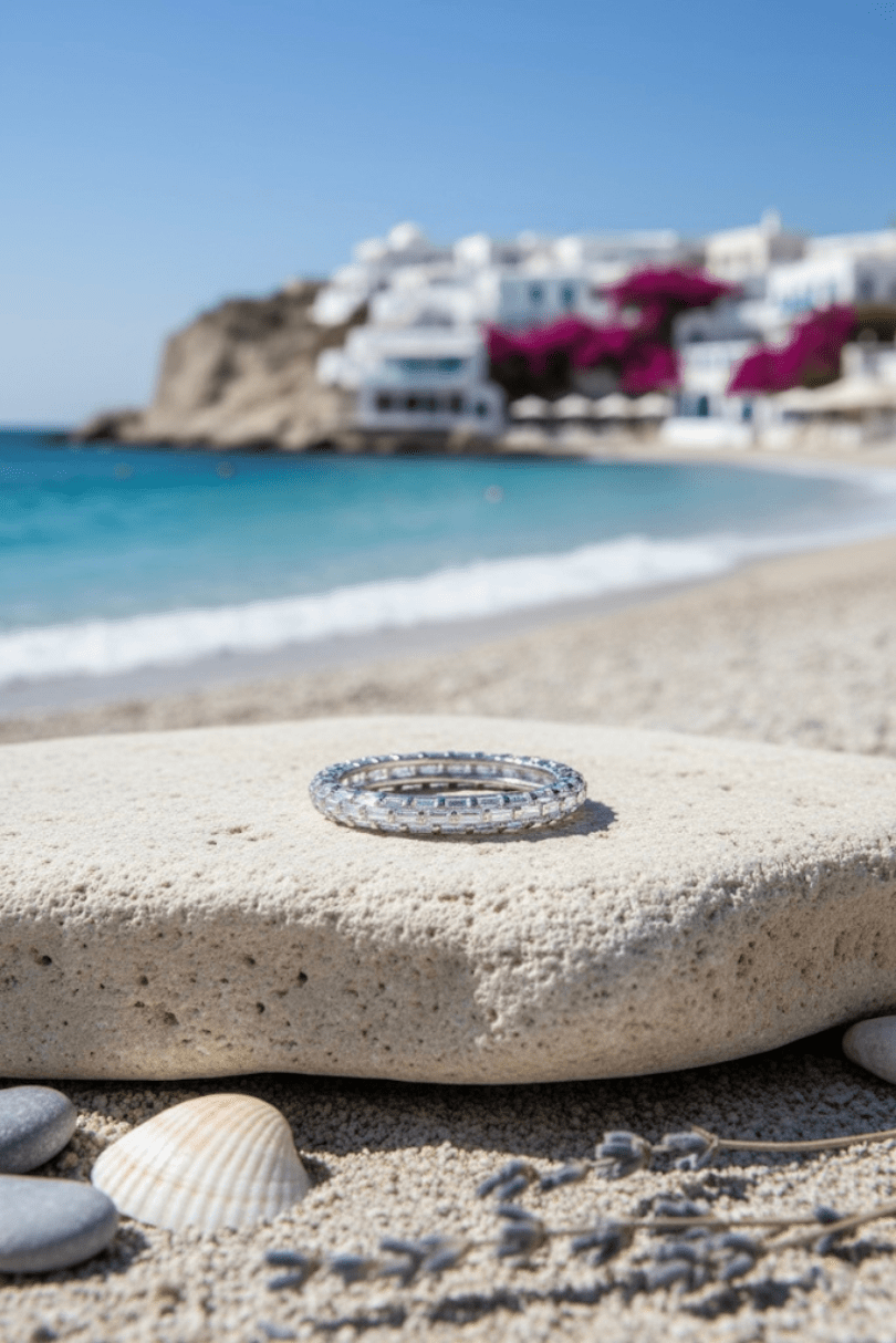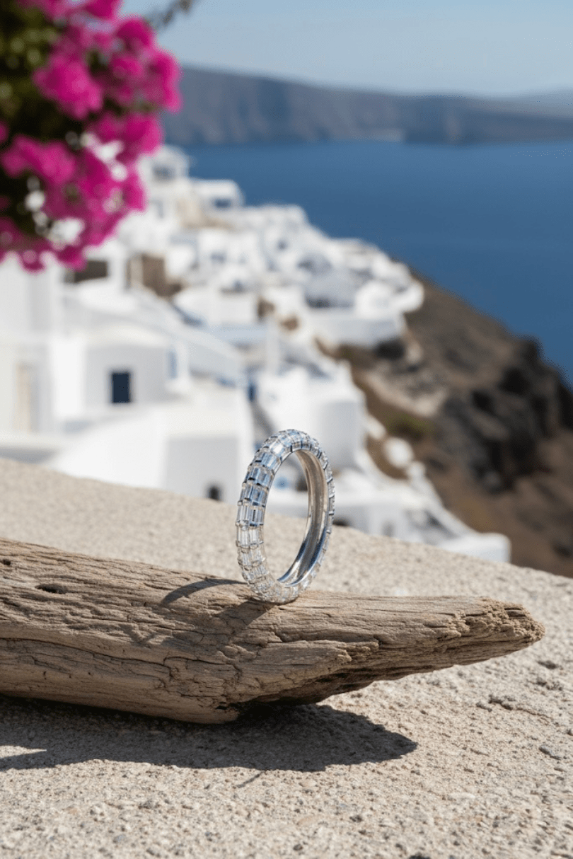 Sleek, modern, and endlessly radiant. This eternity band features a seamless circle of baguette-cut cubic zirconia stones, each precision-set to create a clean, linear sparkle. Crafted in sterling silver and finished with high-polish rhodium plating for a brilliant, tarnish-resistant shine, this ring brings understated glamour to any look. Whether worn alone or stacked, it’s a striking symbol of effortless elegance and timeless style.