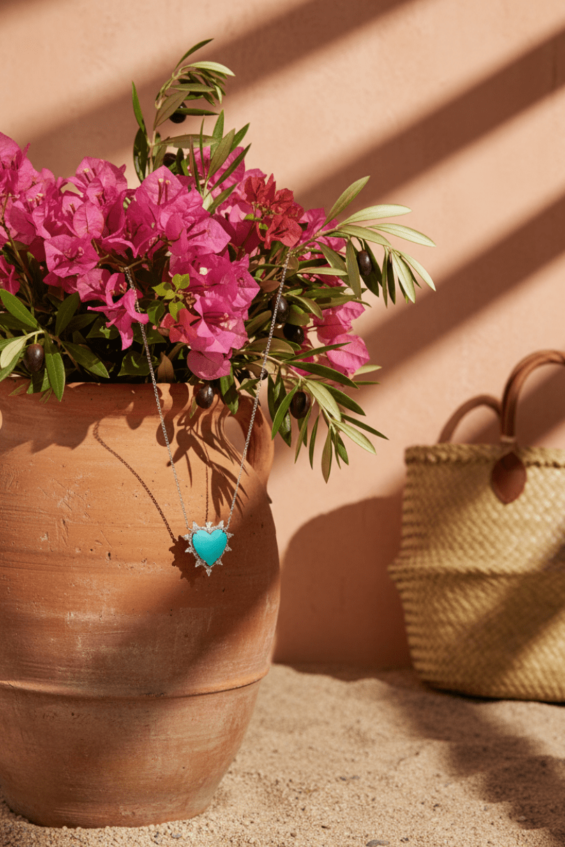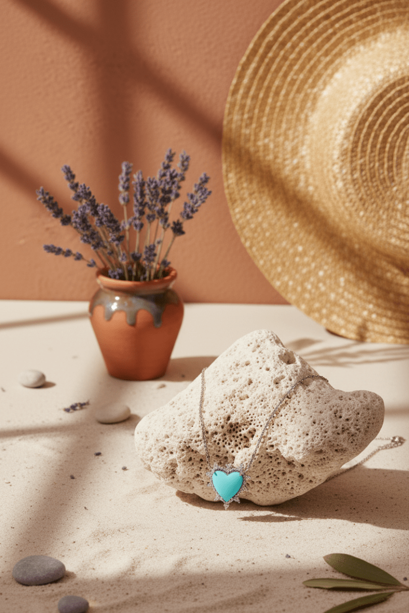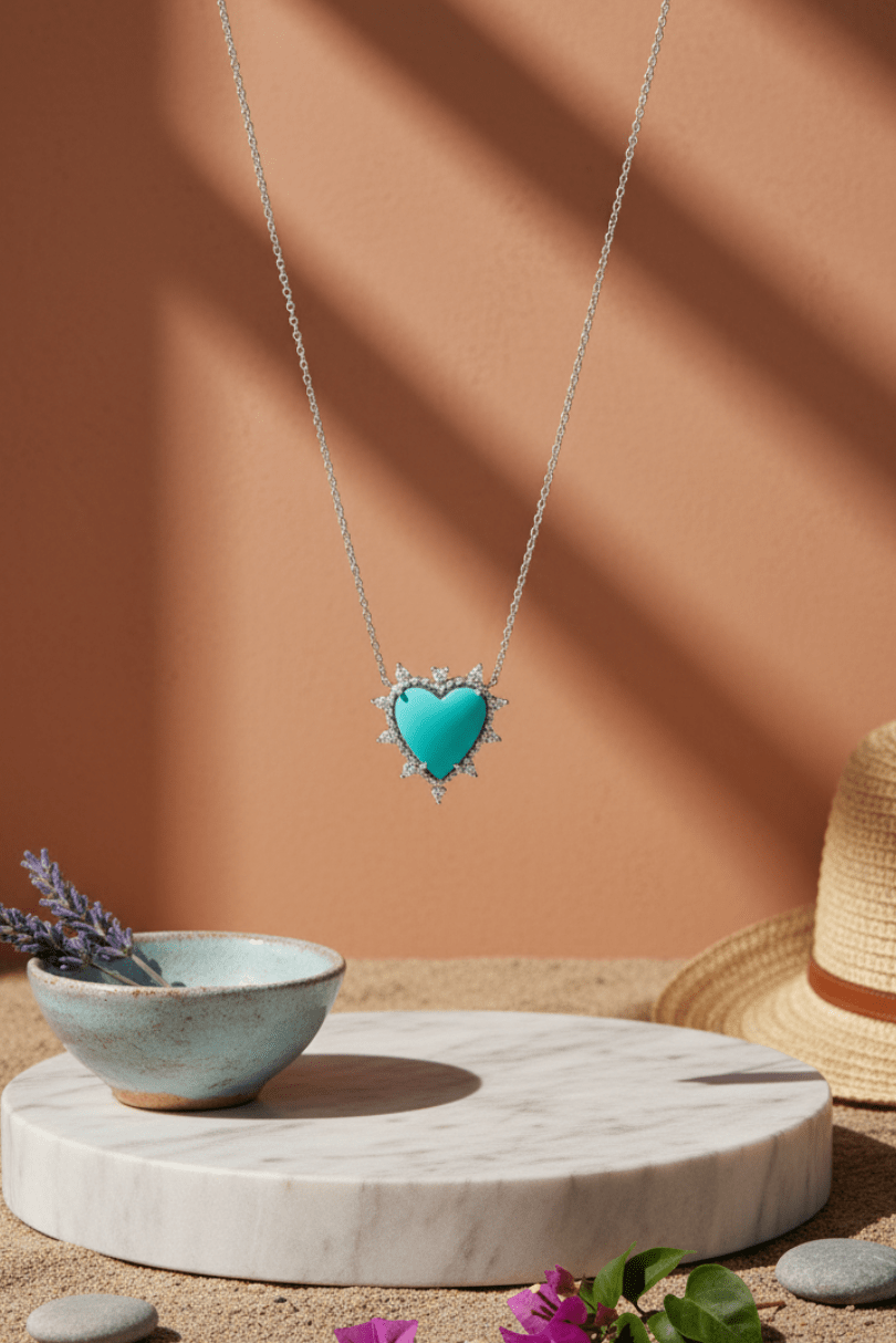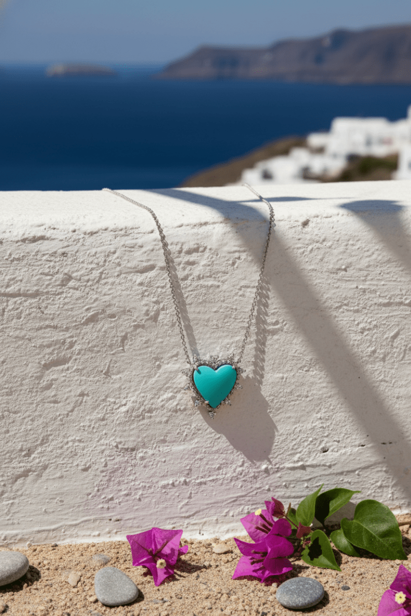 This Twisted Turquoise Heart Necklace is crafted from sterling silver with gorgeous gold or rhodium plating, for a unique and stunning look! The genuine turquoise stone carved into the shape of a heart is enhanced with sparkling cubic zirconias, sure to make your heart skip a beat. Ready for a necklace worthy of admiration? Look no further!
